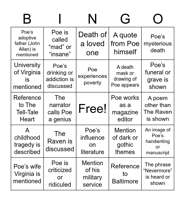 This bingo card has a free space and 24 words: Poe’s wife Virginia is mentioned, The Raven is discussed, Poe experiences poverty, Reference to Baltimore, Poe’s mysterious death, Poe’s adoptive father (John Allan) is mentioned, Poe is called “mad” or “insane”, Death of a loved one, Poe works as a magazine editor, A poem other than The Raven is shown, Reference to The Tell-Tale Heart, Poe’s drinking or addiction is discussed, Mention of dark or gothic themes, An image of Poe’s handwriting or manuscript, University of Virginia is mentioned, Poe is criticized or ridiculed, Mention of his military service, A quote from Poe himself, Poe’s funeral or grave is shown, A childhood tragedy is described, The narrator calls Poe a genius, Poe’s influence on literature, A death mask or drawing of Poe appears and The phrase “Nevermore” is heard or shown.