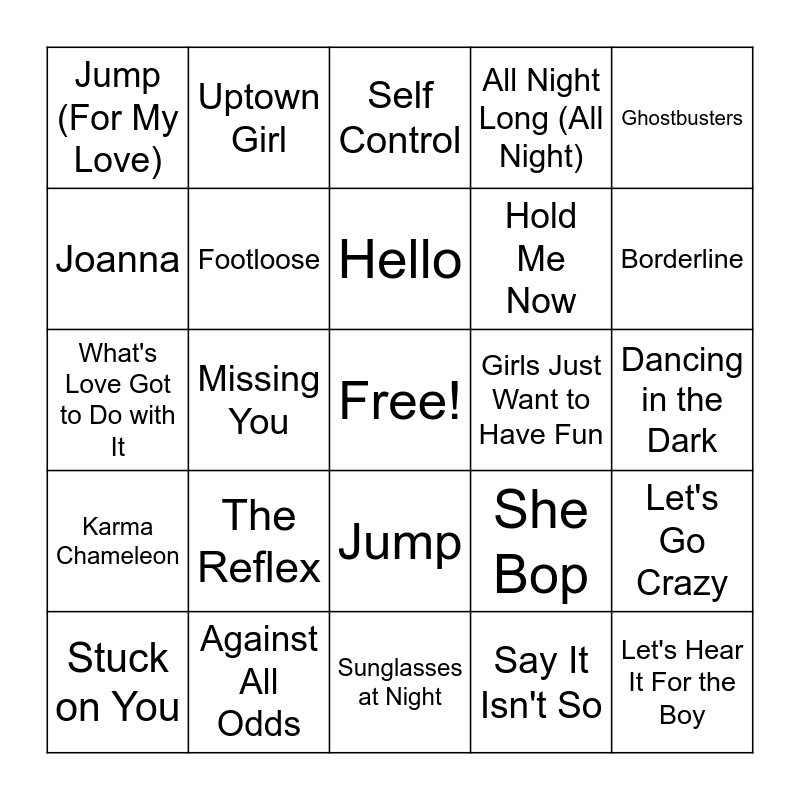 This bingo card has a free space and 40 words: When Doves Cry, What's Love Got to Do with It, Say, Say, Say, Footloose, Against All Odds, Jump, Hello, Owner of a Lonely Heart, Ghostbusters, Karma Chameleon, Missing You, All Night Long (All Night), Let's Hear It For the Boy, Dancing in the Dark, Girls Just Want to Have Fun, The Reflex, Time After Time, Jump (For My Love), Talking in Your Sleep, Self Control, Let's Go Crazy, Say It Isn't So, Hold Me Now, Joanna, I Just Called to Say I Love You, Somebody's Watching Me, Break My Stride, 99 Red Balloons, I Can Dream About You, The Glamorous Life, Oh Sherrie, Stuck on You, I Guess That's Why They Call It the Blues, She Bop, Borderline, Sunglasses at Night, Eyes Without a Face, Here Comes the Rain Again, Uptown Girl and Sister Christian.