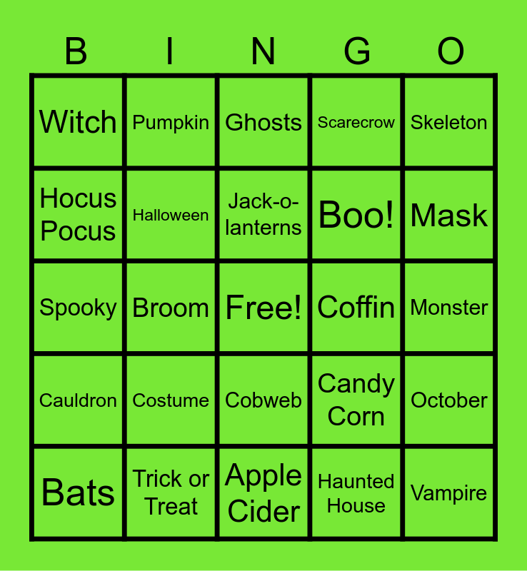 This bingo card has a free space and 24 words: Costume, Trick or Treat, Jack-o-lanterns, Bats, Skeleton, Witch, Hocus Pocus, Pumpkin, Coffin, Cobweb, Boo!, Spooky, Candy Corn, October, Halloween, Haunted House, Monster, Ghosts, Mask, Broom, Vampire, Cauldron, Scarecrow and Apple Cider.