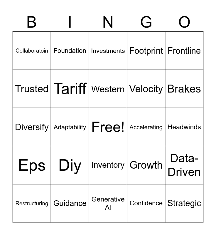 This bingo card has a free space and 52 words: Operating Margin, Strategic, High-Quality, Generative Ai, Diy, Pro, Foundation, Turnaround, Trusted, Bold, Tariff, Optimization, Data-Driven, Growth, Sku'S, 2026, Western, Accelerating, Market Hubs, Frontline, Adaptability, Confidence, Collaboratoin, Velocity, Hvac, Capex, Ryan, Shane, Brakes, Inflation, Gross Profit, Footprint, Sg&A, Net Sales, Cash Flow, Investments, Guidance, Liquidation, Margin, Reaffirming, Lifo, Headwinds, Eps, Capital Expenditures, Inventory, Nimble, Industry, Diversify, Debt, GAAP, Restructuring and Strongest.