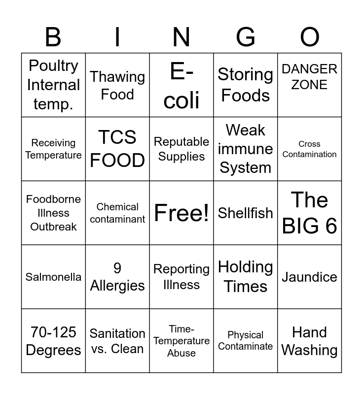This bingo card has a free space and 29 words: 165 degrees, Sanitation vs. Clean, E-coli, FATTOM, DANGER ZONE, Poultry Internal temp., TCS FOOD, Reputable Supplies, Shellfish, Jaundice, 70-125 Degrees, Chemical contaminant, Physical Contaminate, Hand Washing, Foodborne Illness Outbreak, Ground Meat Internal Temperature, Time-Temperature Abuse, Holding Times, Cross Contamination, Salmonella, 9 Allergies, RTE Food, Weak immune System, The BIG 6, Receiving Temperature, Thawing Food, Reporting Illness, Storing Foods and Reheating Foods.