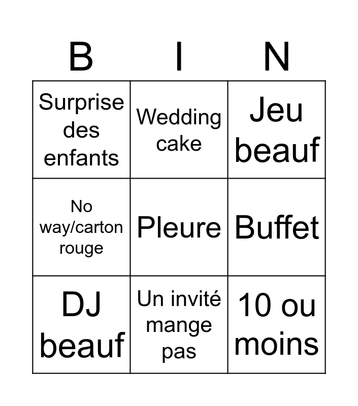 This bingo card has a free space and 8 words: Buffet, Jeu beauf, Wedding cake, DJ beauf, Surprise des enfants, 10 ou moins, No way/carton rouge and Un invité mange pas.