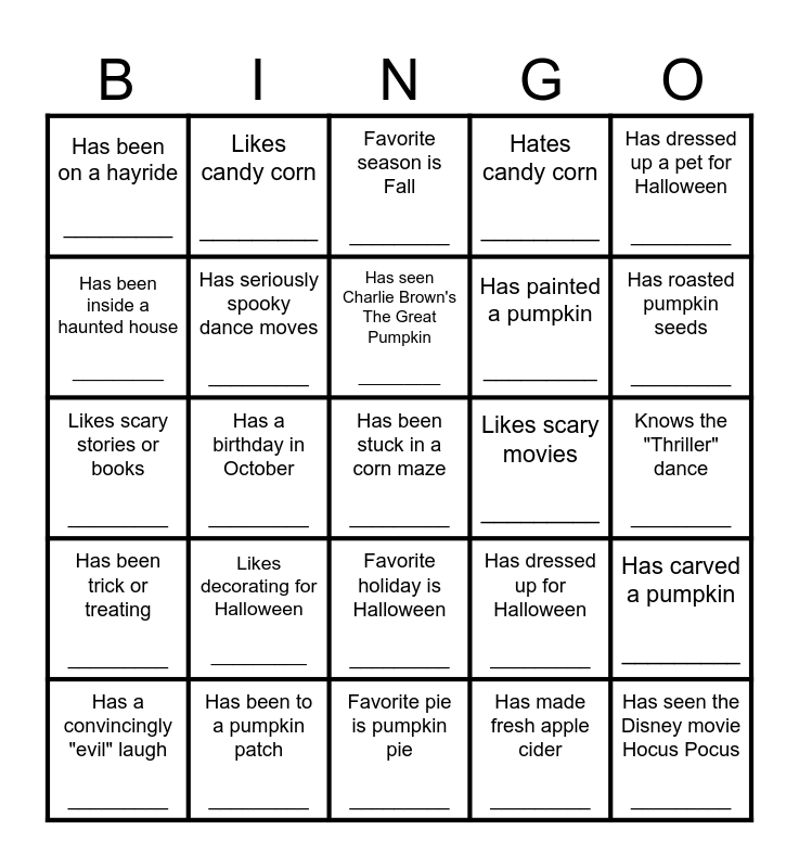 This bingo card has 25 words: Likes decorating for Halloween _________, Favorite pie is pumpkin pie _________, Has seen Charlie Brown's The Great Pumpkin _________, Has a convincingly "evil" laugh _________, Has dressed up a pet for Halloween _________, Has been on a hayride _________, Has been inside a haunted house _________, Likes candy corn _________, Likes scary movies _________, Favorite holiday is Halloween _________, Has painted a pumpkin _________, Likes scary stories or books _________, Has dressed up for Halloween _________, Has carved a pumpkin _________, Has seriously spooky dance moves _________, Has seen the Disney movie Hocus Pocus _________, Knows the "Thriller" dance _________, Favorite season is Fall _________, Has roasted pumpkin seeds _________, Has a birthday in October _________, Has been stuck in a corn maze _________, Has been to a pumpkin patch _________, Has been trick or treating _________, Hates candy corn _________ and Has made fresh apple cider _________.