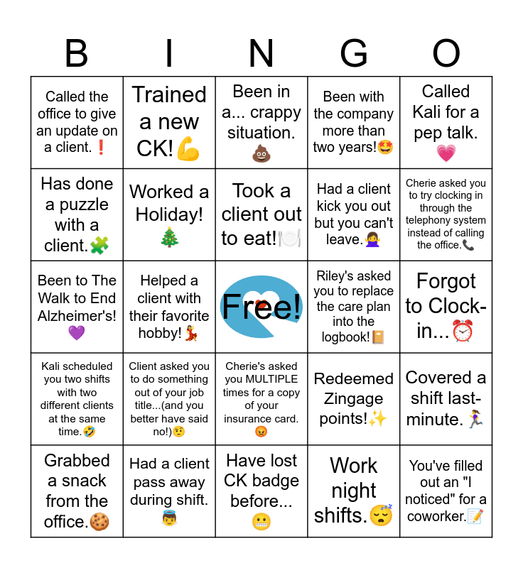 This bingo card has a free space and 24 words: Client asked you to do something out of your job title...(and you better have said no!)๐คจ, Had a client pass away during shift.๐ผ, Took a client out to eat!๐ฝ, Grabbed a snack from the office.๐ช, Called Kali for a pep talk.๐, Called the office to give an update on a client.โ, Has done a puzzle with a client.๐งฉ, Trained a new CK!๐ช, Riley's asked you to replace the care plan into the logbook!๐, Cherie's asked you MULTIPLE times for a copy of your insurance card.๐ก, Had a client kick you out but you can't leave.๐ โโ๏ธ, Been to The Walk to End Alzheimer's!๐, Redeemed Zingage points!โจ, Covered a shift last-minute.๐โโ๏ธ, Worked a Holiday!๐, Work night shifts.๐ด, Forgot to Clock-in...โฐ, Been in a... crappy situation.๐ฉ, Cherie asked you to try clocking in through the telephony system instead of calling the office.๐, Helped a client with their favorite hobby!๐, You've filled out an "I noticed" for a coworker.๐, Kali scheduled you two shifts with two different clients at the same time.๐คฃ, Been with the company more than two years!๐คฉ and Have lost CK badge before...๐ฌ.