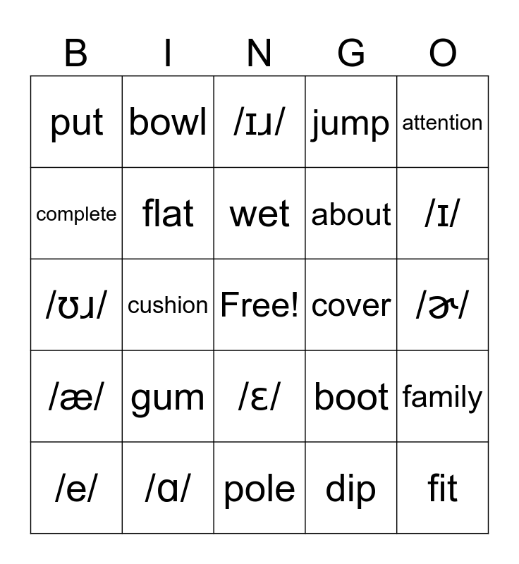 This bingo card has a free space and 48 words: ham, fit, whole, pole, gum, fork, bowl, hospital, complete, cop, flat, jump, family, boot, root, push, wet, cover, book, attention, cushion, dip, put, about, /i/, /ɪ/, /e/, /eɪ/, /ɛ/, /æ/, /u/, /o/, /ʊ/, /ɔ/, /ɑ/, /ə/, /ʌ/, /ɚ/, /ɝ/, /aɪ/, /ɔɪ/, /aʊ/, /ɪɹ/, /ɛɹ/, /ʊɹ/, /ɔɹ/, /ɑɹ/ and /oʊ/.