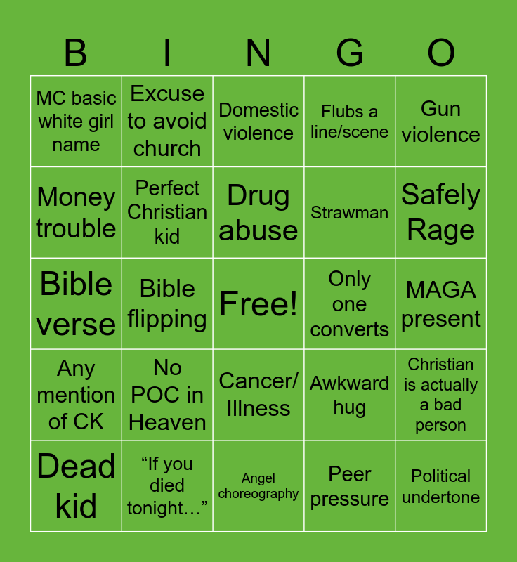 This bingo card has a free space and 24 words: No POC in Heaven, “If you died tonight…”, Drug abuse, Dead kid, Gun violence, MC basic white girl name, Money trouble, Excuse to avoid church, Only one converts, Cancer/ Illness, Strawman, Bible verse, Awkward hug, Christian is actually a bad person, Perfect Christian kid, Peer pressure, MAGA present, Domestic violence, Safely Rage, Bible flipping, Political undertone, Any mention of CK, Flubs a line/scene and Angel choreography.