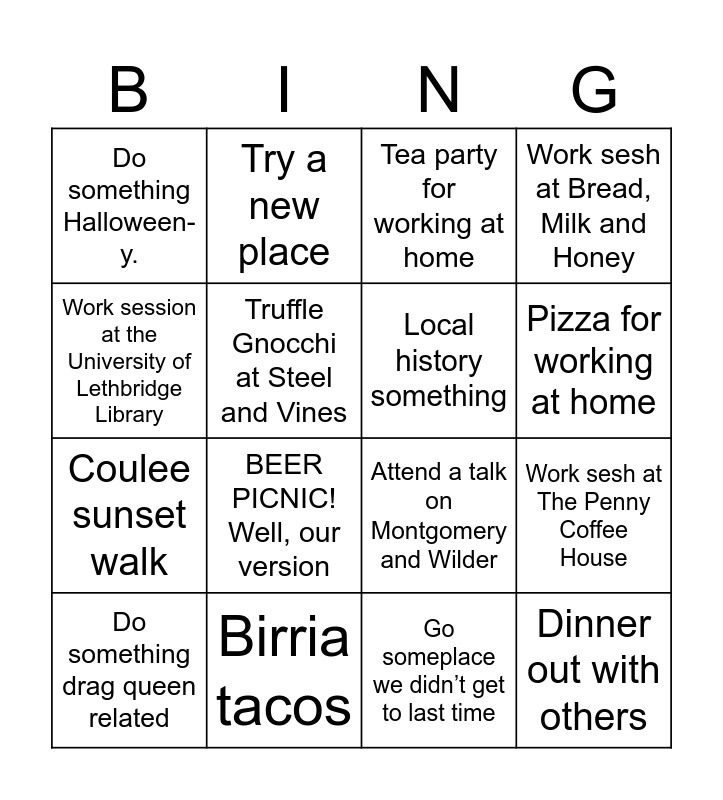 This bingo card has 16 words: Birria tacos, Work sesh at The Penny Coffee House, Tea party for working at home, Do something Halloween-y., Coulee sunset walk, Try a new place, Attend a talk on Montgomery and Wilder, Go someplace we didn’t get to last time, Work session at the University of Lethbridge Library, Truffle Gnocchi at Steel and Vines, Do something drag queen related, Work sesh at Bread, Milk and Honey, BEER PICNIC! Well, our version, Pizza for working at home, Local history something and Dinner out with others.
