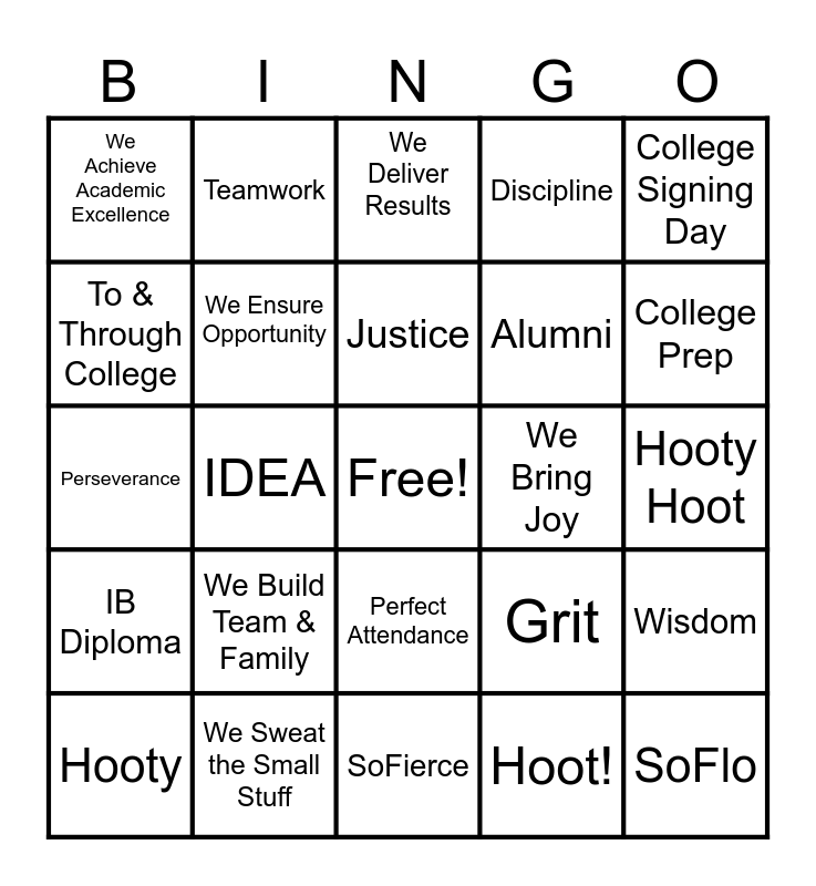 This bingo card has a free space and 29 words: Hooty, College for All, IDEA, We Act with Integrity, We Achieve Academic Excellence, We Deliver Results, We Ensure Opportunity, We Build Team & Family, We Bring Joy, We Sweat the Small Stuff, Hooty Hoot, SoFlo, SoFierce, Hoot!, College Prep, A - Honor Roll, Perfect Attendance, IB Diploma, College Signing Day, Perseverance, Grit, Tenacity, Alumni, To & Through College, Discipline, Teamwork, Wisdom, Justice and PBIS.
