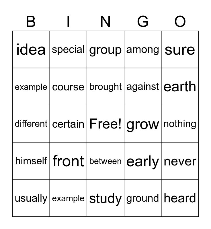 This bingo card has a free space and 24 words: front, example, brought, usually, sure, idea, example, special, grow, between, against, different, early, never, course, ground, nothing, group, earth, certain, heard, himself, among and study.