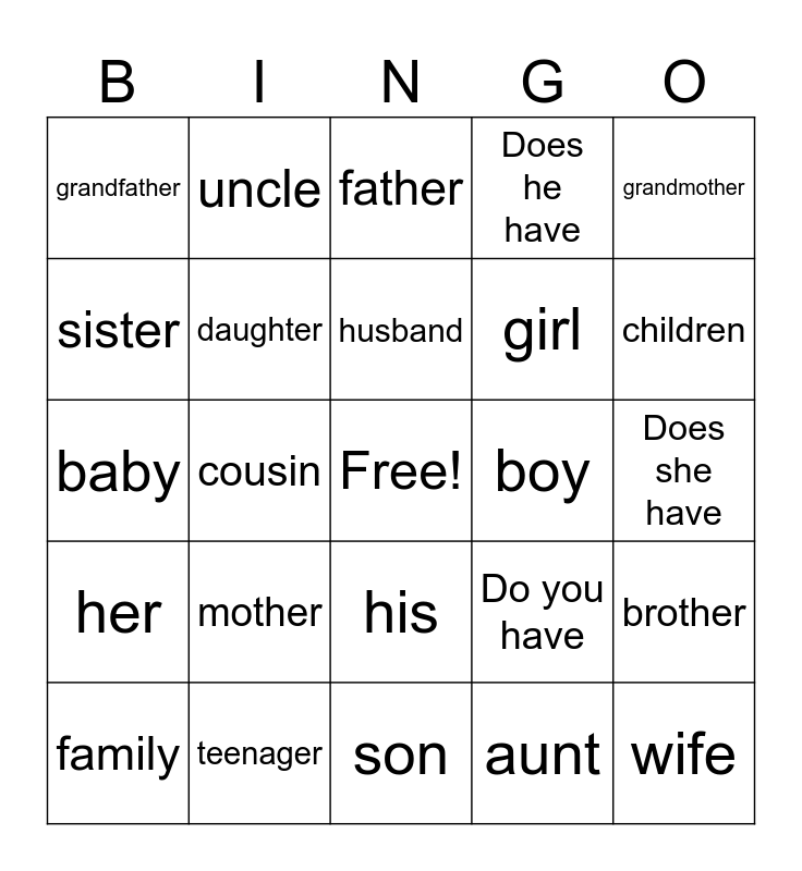 This bingo card has a free space and 24 words: mother, teenager, husband, family, grandmother, grandfather, sister, uncle, boy, his, girl, baby, Do you have, brother, daughter, aunt, Does she have, father, children, cousin, wife, her, Does he have and son.