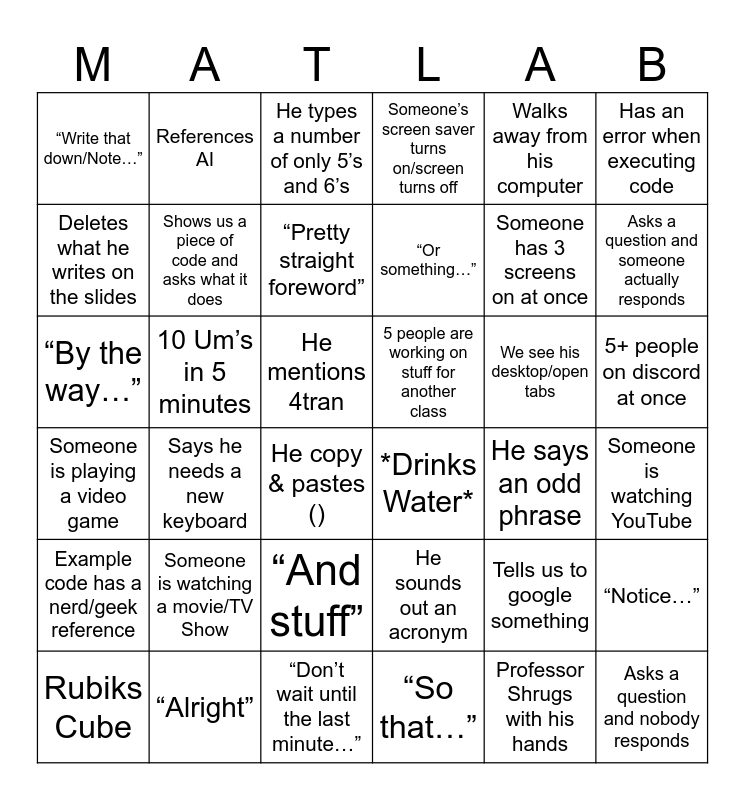 This bingo card has 53 words: Random coding history fact, “By the way…”, Someone asks a question, Someone is watching YouTube, We see his desktop/open tabs, Professor Shrugs with his hands, References AI, Closes a tab too early/quickly, Has an error when executing code, Asks a question and nobody responds, Deletes what he writes on the slides, “Don’t wait until the last minute…”, Says he needs a new keyboard, Someone is playing a video game, Professors keyboard doesn’t work, He copy & pastes (), Shows us a piece of code and asks what it does, 10 Um’s in 5 minutes, Mentions DND or an RPG, Walks away from his computer, Asks a question and someone actually responds, Example code has a nerd/geek reference, “Pretty straight foreword”, “Write that down/Note…”, “Neat little…”, *Drinks Water*, Tells us to google something, Someone is on their laptop googling random stuff, He sounds out an acronym, “Or something…”, 15 OK’s in 5 minutes, “Alright”, “Sort of”, “Ok um so”, “So that…”, “Notice…”, Someone’s screen saver turns on/screen turns off, He says an odd phrase, He types a number of only 5’s and 6’s, “Oops”, Someone leaves >20 minutes early, Someone arrives > 20 minutes late, He mentions 4tran, “We remember…”, 10+ people on the phone at once, 5+ people on discord at once, “And stuff”, Rubiks Cube, Someone has 3 screens on at once, 5 people are working on stuff for another class, 5 people are working on stuff for this class, Someone is watching a movie/TV Show and Someone is reading a book.