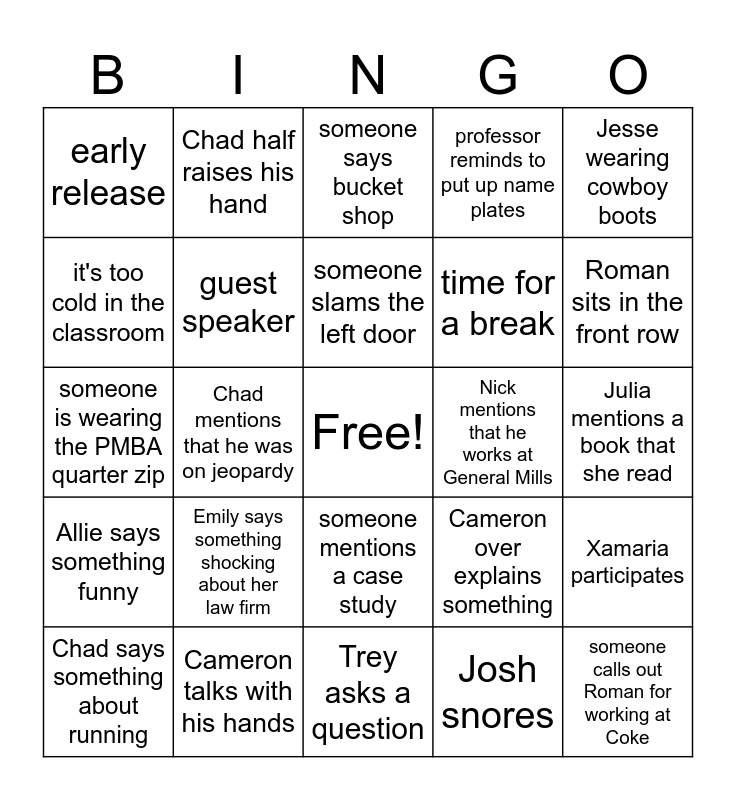 This bingo card has a free space and 46 words: Rob mentions that he works at Ford, someone calls out Roman for working at Coke, Dallis makes a cheeky comment, Trey asks a question, Emily says something shocking about her law firm, Julia reads something off ChatGPT, Chad half raises his hand, someone brings snacks, it's too cold in the classroom, technical difficulties, guest speaker, professor reminds to put up name plates, Xamaria participates, Cameron over explains something, Dr. Andrew mentions that he's a doctor, John says something funny, someone slams the left door, Nick mentions that he works at General Mills, someone talks about AI, Jesse wearing cowboy boots, Chad mentions that he was on jeopardy, Josh snores, early release, time for a break, Breanna wears a mask, Roman sits in the front row, Chad says something about running, Jesse challenges the professor, someone mentions a case study, Allie says something funny, Nick participates, Trey mentions insurance, Ricky participates, Julia mentions one of the many industries she's worked in, John wears his wife's blue light glasses, Cameron talks with his hands, Julia mentions a book that she read, Jesse mentions that he works at Morgan Stanley, Dallis gets free legal advice, Allan asks a question and the room goes silent, we get split into discussion groups, someone says bucket shop, someone is wearing the PMBA quarter zip, Jesse gets up and leaves the room more than once, Dallis outburst and a rando joins our class.
