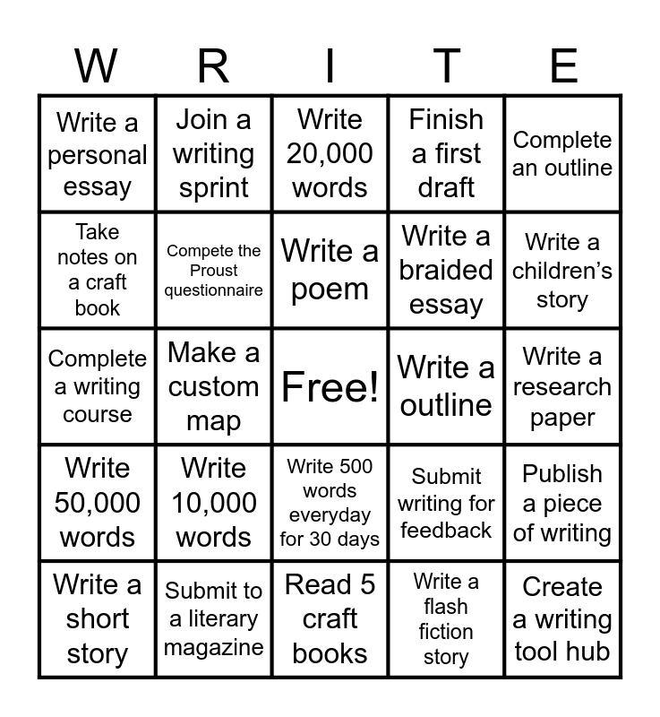 This bingo card has a free space and 24 words: Write 10,000 words, Submit to a literary magazine, Write a poem, Write a short story, Complete an outline, Write a personal essay, Take notes on a craft book, Join a writing sprint, Write a outline, Write 500 words everyday for 30 days, Write a braided essay, Complete a writing course, Submit writing for feedback, Publish a piece of writing, Compete the Proust questionnaire, Write a flash fiction story, Write a research paper, Write 20,000 words, Write a children’s story, Make a custom map, Create a writing tool hub, Write 50,000 words, Finish a first draft and Read 5 craft books.