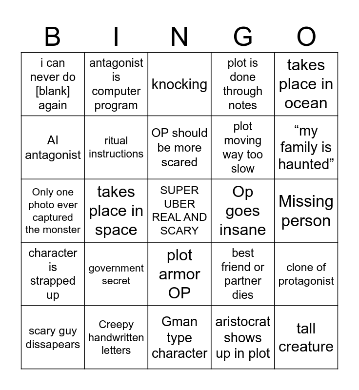 This bingo card has a free space and 49 words: abandoned location, tall creature, takes place in the woods, Gman type character, government secret, monster is scary black thing, antagonist is computer program, alternate reality, AI antagonist, ghost randomly appears in OPs house, ritual instructions, plot is done through notes, clone of protagonist, best friend or partner dies, message from beyond, OP is more scared than he has any right to be, OP should be more scared, Op goes insane, haunted inanimate object, takes place in ocean, takes place in space, aristocrat shows up in plot, i can never do [blank] again, plot moving way too slow, plot moving way too fast, “my family is haunted”, scary guy dissapears, haunted childrens character, plot armor OP, character is strapped up, OP accepts dumb offer, needless shock horror, japan = scary, skeletal creature, Creepy handwritten letters, Unknown number calling, Distorted voice says protagonist’s name, weird dream, Missing person, Face appears somewhere it shouldnt, faceless monster, Forum thread that suddenly vanishes, Entity imitates voices, Strange man outside window, Only one photo ever captured the monster, knocking, Ending implies you, the reader, are next, Symbols drawn in places and Object returns after being destroyed.