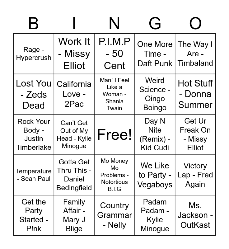 This bingo card has a free space and 40 words: Without Me - Eminem, Rock Your Body - Justin Timberlake, Pump It - Black Eye Peas, California Love - 2Pac, Family Affair - Mary J Blige, Mo Money Mo Problems - Notortious B.I.G, Man! I Feel Like a Woman - Shania Twain, Rhythm Nation - Janet Jackson, The Way I Are - Timbaland, Temperature - Sean Paul, Can’t Get Out of My Head - Kylie Minogue, One More Time - Daft Punk, Ms. Jackson - OutKast, Get Ur Freak On - Missy Elliot, Day N Nite (Remix) - Kid Cudi, Gotta Get Thru This - Daniel Bedingfield, Just a little Bit - 50 Cent, Rage - Hypercrush, Fame - David Bowie, P.I.M.P - 50 Cent, Victory Lap - Fred Again, Padam Padam - Kylie Minogue, Weird Science - Oingo Boingo, Lost You - Zeds Dead, Beautiful - Snoop Dogg, Push the Feeling On - Nightcrawlers, Girls Girls Girls - Motley Crew, Every time we Touch - Cascada, Careless Whisper - George Michael, Tipsy - J-Kwon, Good Vibration - Marky Mark and the Funky Bunch, Get the Party Started - P!nk, Oops!..I did it again - Britney Spears, We Like to Party - Vegaboys, Hot Stuff - Donna Summer, Country Grammar - Nelly, Buy U a Drank - T Pain, I Will Survive - Gloria Gaynor, Work It - Missy Elliot and Doo Wop - Lauryn Hill.