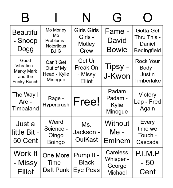 This bingo card has a free space and 40 words: Rhythm Nation - Janet Jackson, The Way I Are - Timbaland, Temperature - Sean Paul, Can’t Get Out of My Head - Kylie Minogue, One More Time - Daft Punk, Ms. Jackson - OutKast, Get Ur Freak On - Missy Elliot, Day N Nite (Remix) - Kid Cudi, Gotta Get Thru This - Daniel Bedingfield, Just a little Bit - 50 Cent, Rage - Hypercrush, Fame - David Bowie, P.I.M.P - 50 Cent, Victory Lap - Fred Again, Padam Padam - Kylie Minogue, Weird Science - Oingo Boingo, Lost You - Zeds Dead, Beautiful - Snoop Dogg, Push the Feeling On - Nightcrawlers, Girls Girls Girls - Motley Crew, Every time we Touch - Cascada, Careless Whisper - George Michael, Tipsy - J-Kwon, Good Vibration - Marky Mark and the Funky Bunch, Get the Party Started - P!nk, Oops!..I did it again - Britney Spears, We Like to Party - Vegaboys, Hot Stuff - Donna Summer, Country Grammar - Nelly, Buy U a Drank - T Pain, I Will Survive - Gloria Gaynor, Work It - Missy Elliot, Doo Wop - Lauryn Hill, Without Me - Eminem, Rock Your Body - Justin Timberlake, Pump It - Black Eye Peas, California Love - 2Pac, Family Affair - Mary J Blige, Mo Money Mo Problems - Notortious B.I.G and Man! I Feel Like a Woman - Shania Twain.