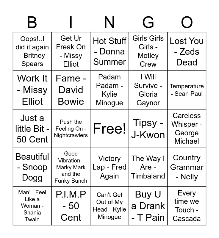 This bingo card has a free space and 40 words: Gotta Get Thru This - Daniel Bedingfield, Just a little Bit - 50 Cent, Rage - Hypercrush, Fame - David Bowie, P.I.M.P - 50 Cent, Victory Lap - Fred Again, Padam Padam - Kylie Minogue, Weird Science - Oingo Boingo, Lost You - Zeds Dead, Beautiful - Snoop Dogg, Push the Feeling On - Nightcrawlers, Girls Girls Girls - Motley Crew, Every time we Touch - Cascada, Careless Whisper - George Michael, Tipsy - J-Kwon, Good Vibration - Marky Mark and the Funky Bunch, Get the Party Started - P!nk, Oops!..I did it again - Britney Spears, We Like to Party - Vegaboys, Hot Stuff - Donna Summer, Country Grammar - Nelly, Buy U a Drank - T Pain, I Will Survive - Gloria Gaynor, Work It - Missy Elliot, Doo Wop - Lauryn Hill, Without Me - Eminem, Rock Your Body - Justin Timberlake, Pump It - Black Eye Peas, California Love - 2Pac, Family Affair - Mary J Blige, Mo Money Mo Problems - Notortious B.I.G, Man! I Feel Like a Woman - Shania Twain, Rhythm Nation - Janet Jackson, The Way I Are - Timbaland, Temperature - Sean Paul, Can’t Get Out of My Head - Kylie Minogue, One More Time - Daft Punk, Ms. Jackson - OutKast, Get Ur Freak On - Missy Elliot and Day N Nite (Remix) - Kid Cudi.