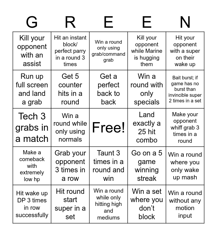 This bingo card has a free space and 24 words: Hit wake up DP 3 times in row successfully, Grab your opponent 3 times in a row, Get a perfect back to back, Win a set where you don’t block, Hit your opponent with a super on their wake up, Kill your opponent with an assist, Hit an instant block/ perfect parry in a round 3 times, Win a round only using grab/command grab, Land exactly a 25 hit combo, Make your opponent whiff grab 3 times in a round, Tech 3 grabs in a match, Get 5 counter hits in a round, Go on a 5 game winning streak, Win a round where you only wake up mash, Run up full screen and land a grab, Hit round start super in a set, Win a round while only hitting high and mediums, Kill your opponent while Marine is hugging them, Bait burst; if game has no burst than invincible super 2 times in a set, Make a comeback with extremely low hp, Win a round while only using normals, Taunt 3 times in a round and win, Win a round with only specials and Win a round without any motion input.