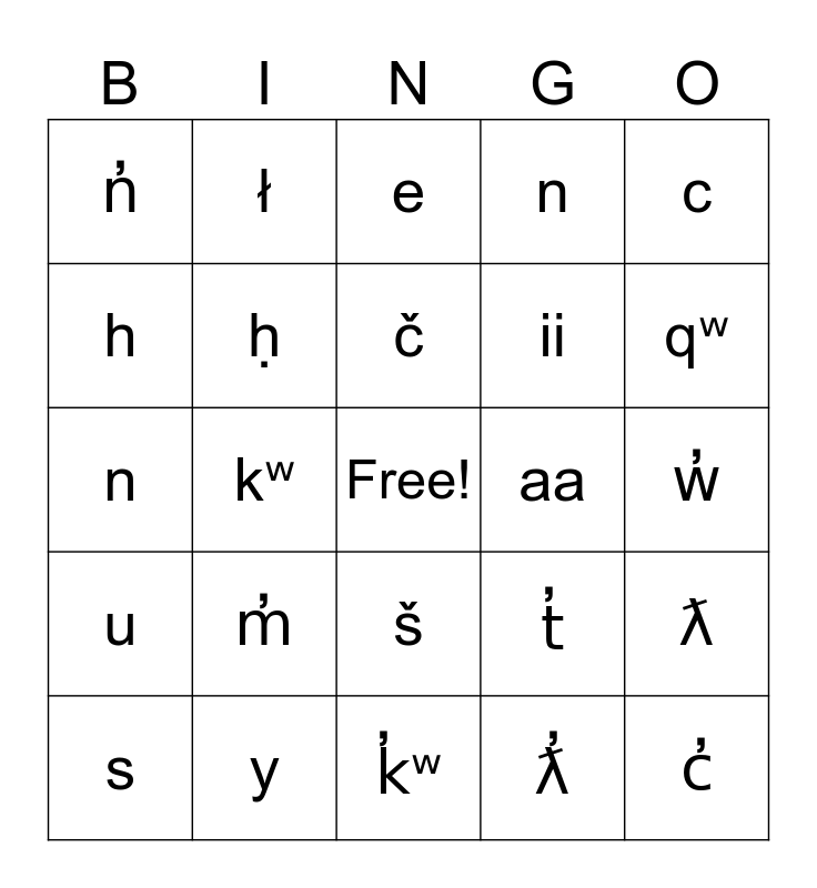 This bingo card has a free space and 47 words: a, c̓, i, k̓ʷ, m̓, k, ł, q, h, č́, ḥ, n, ƛ, t̓, m, p, č, aa, k̓, c, kʷ, ƛ̓, n̓, ii, p̓, qʷ, s, t, š, u, w, x, uu, xʷ, x̌, y, w̓, Ɂ, x̌ʷ, y̓, ʕ, e, n, ee, oo, x̣ and x̣ʷ.