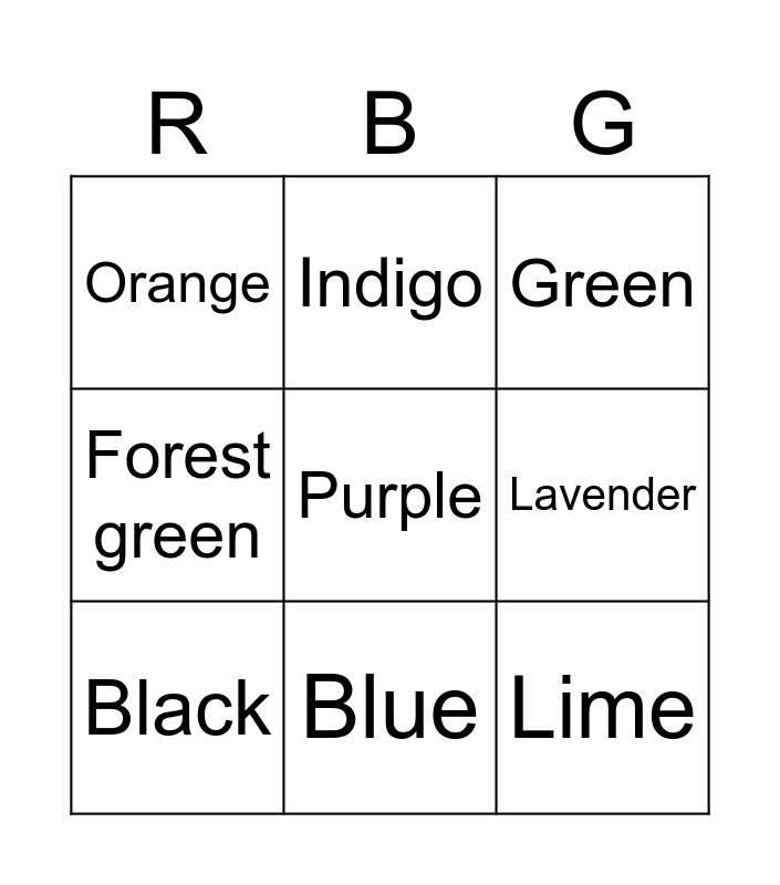 This bingo card has 15 words: Red, Blue, Green, Orange, Purple, Lime, Yellow, Pink, White, Black, Brown, Lavender, Forest green, Indigo and Gray.