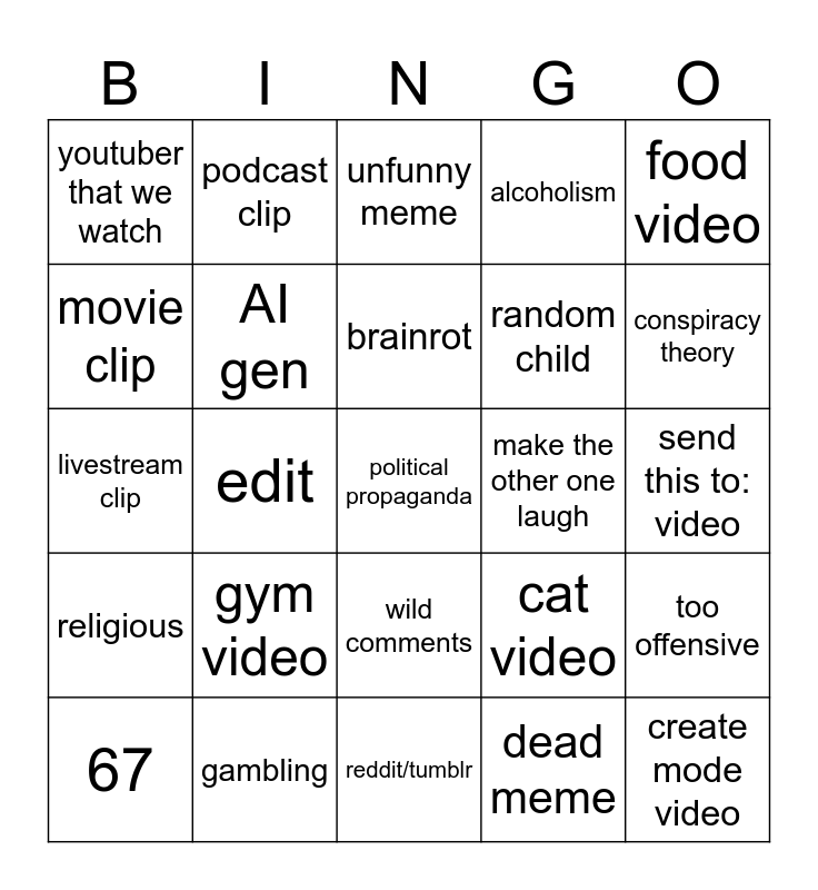 This bingo card has 25 words: gym video, reddit/tumblr, brainrot, 67, food video, youtuber that we watch, movie clip, podcast clip, make the other one laugh, wild comments, random child, livestream clip, cat video, too offensive, AI gen, create mode video, send this to: video, unfunny meme, conspiracy theory, edit, political propaganda, gambling, religious, alcoholism and dead meme.