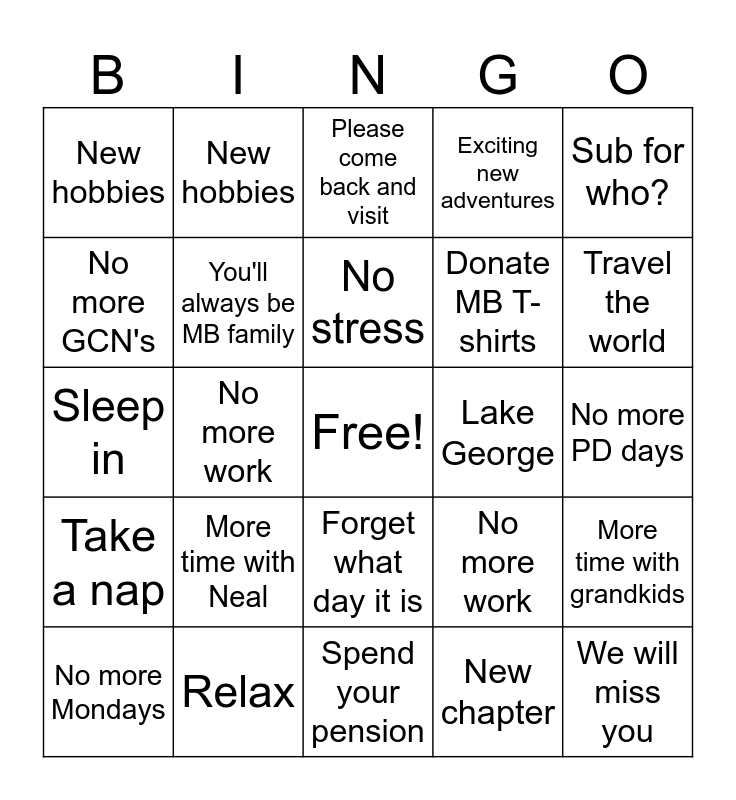 This bingo card has a free space and 27 words: No more work, Hot tub with hubby, Donate MB T-shirts, Spend your pension, No more GCN's, Please come back and visit, New hobbies, Take a nap, Lake George, More time with grandkids, Sleep in, Exciting new adventures, No more Mondays, Relax, Travel the world, Do nothing, You'll always be MB family, No stress, More time with Neal, New hobbies, No more PD days, New chapter, No more work, We will miss you, Forget what day it is, Sub for who? and Made lifelong friendships.