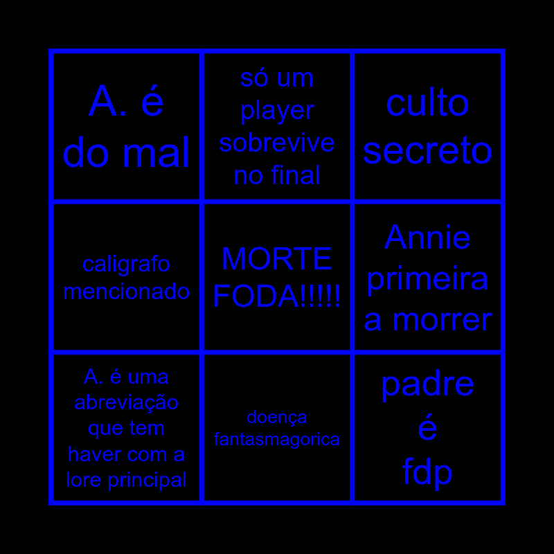 This bingo card has a free space and 8 words: Annie primeira a morrer, culto secreto, só um player sobrevive no final, A. é uma abreviação que tem haver com a lore principal, A. é do mal, padre é fdp, caligrafo mencionado and doença fantasmagorica.