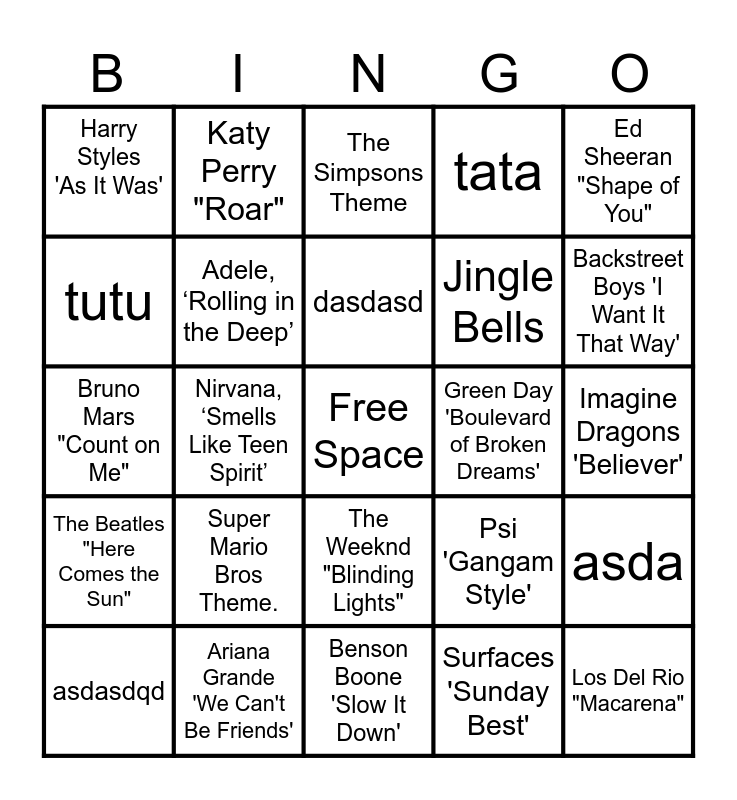 This bingo card has a free space and 30 words: Ariana Grande 'We Can't Be Friends', Carly Rae Jepson "Call Me Maybe", Nirvana, ‘Smells Like Teen Spirit’, Billie Eilish 'Bad Guy', Harry Styles 'As It Was', The Simpsons Theme, Adele, ‘Rolling in the Deep’, The Weeknd "Blinding Lights", Green Day 'Boulevard of Broken Dreams', Benson Boone 'Slow It Down', Imagine Dragons 'Believer', Los Del Rio "Macarena", Surfaces 'Sunday Best', Star Wars Theme, Backstreet Boys 'I Want It That Way', Queen "We Will Rock You", Psi 'Gangam Style', The Beatles "Here Comes the Sun", Super Mario Bros Theme., Ed Sheeran "Shape of You", Bruno Mars "Count on Me", Taylor Swift "Shake It Off", Katy Perry "Roar", Jingle Bells, tutu, tata, asda, asdasdqd, dasdasd and asdasda.