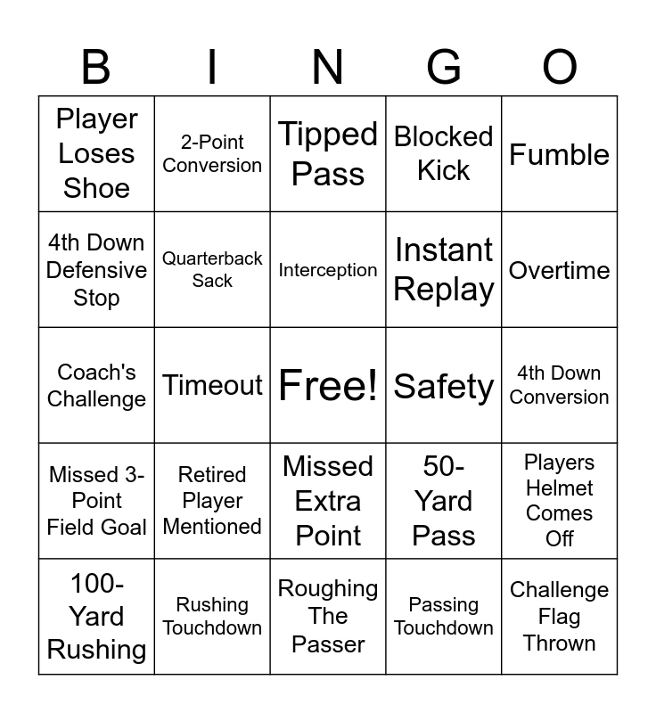 This bingo card has a free space and 24 words: Retired Player Mentioned, Rushing Touchdown, Interception, 100-Yard Rushing, Fumble, Player Loses Shoe, 4th Down Defensive Stop, 2-Point Conversion, Safety, Missed Extra Point, Instant Replay, Coach's Challenge, 50-Yard Pass, Players Helmet Comes Off, Quarterback Sack, Passing Touchdown, 4th Down Conversion, Tipped Pass, Overtime, Timeout, Challenge Flag Thrown, Missed 3-Point Field Goal, Blocked Kick and Roughing The Passer.