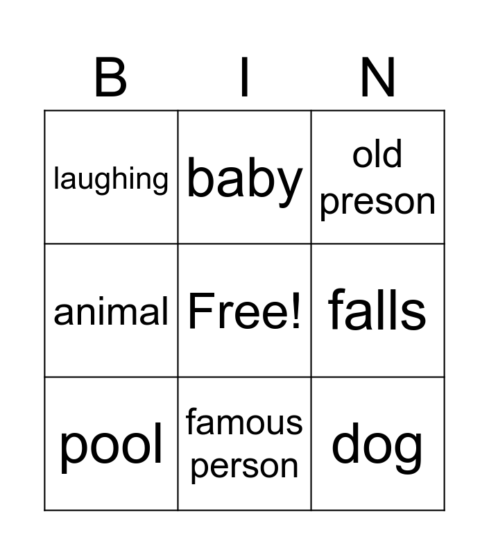 This bingo card has a free space and 8 words: falls, old preson, baby, pool, laughing, dog, animal and famous person.