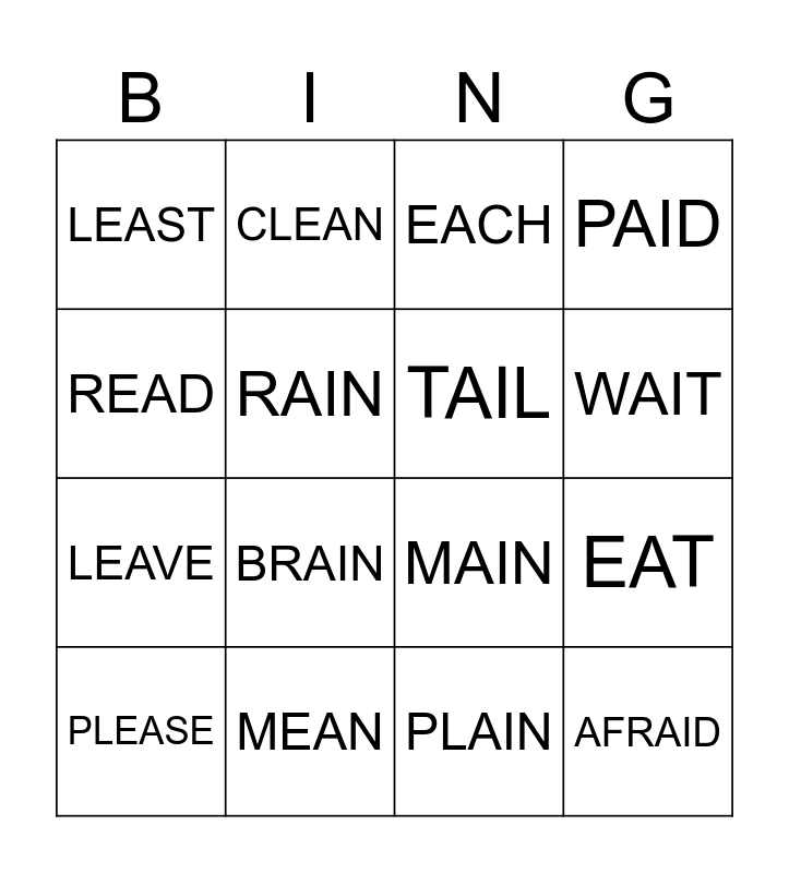 This bingo card has 20 words: EAT, SEA, EACH, TEA, PLEASE, READ, MEAN, LEAST, LEAVE, CLEAN, BRAIN, MAIN, RAIN, AFRAID, TAIL, TRAIN, WAIT, PAID, PLAIN and RAISE.