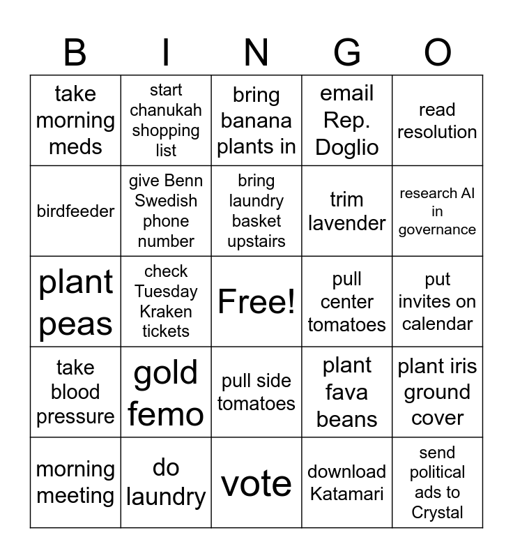 This bingo card has a free space and 24 words: gold femo, do laundry, bring laundry basket upstairs, morning meeting, read resolution, take morning meds, birdfeeder, start chanukah shopping list, pull center tomatoes, pull side tomatoes, trim lavender, plant peas, plant fava beans, plant iris ground cover, give Benn Swedish phone number, download Katamari, put invites on calendar, bring banana plants in, research AI in governance, check Tuesday Kraken tickets, send political ads to Crystal, take blood pressure, email Rep. Doglio and vote.