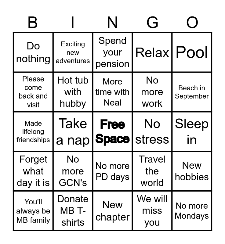 This bingo card has a free space and 26 words: No more PD days, We will miss you, More time with Neal, Donate MB T-shirts, Pool, Do nothing, Please come back and visit, Exciting new adventures, Sleep in, Travel the world, No more work, Made lifelong friendships, New hobbies, You'll always be MB family, Take a nap, More time with Grandkids, Relax, Forget what day it is, Spend your pension, No more Mondays, Beach in September, New chapter, No stress, No more GCN's, Hot tub with hubby and Lake George.