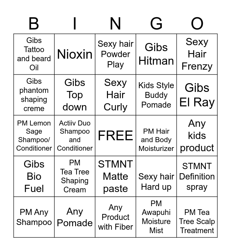 This bingo card has a free space and 24 words: PM Any Shampoo, PM Tea Tree Shaping Cream, Sexy Hair Curly, PM Awapuhi Moisture Mist, Sexy Hair Frenzy, Gibs Tattoo and beard Oil, Nioxin, Sexy hair Powder Play, PM Hair and Body Moisturizer, Any kids product, PM Lemon Sage Shampoo/ Conditioner, Gibs Top down, Sexy hair Hard up, STMNT Definition spray, Gibs phantom shaping creme, Any Pomade, Any Product with Fiber, Gibs Hitman, Gibs El Ray, Gibs Bio Fuel, Actiiv Duo Shampoo and Conditioner, STMNT Matte paste, Kids Style Buddy Pomade and PM Tea Tree Scalp Treatment.