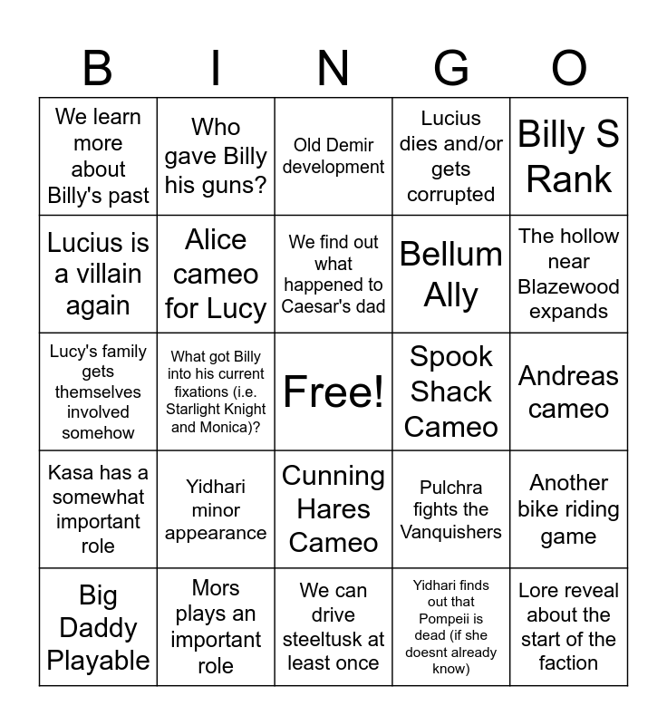 This bingo card has a free space and 24 words: Yidhari minor appearance, Mors plays an important role, We find out what happened to Caesar's dad, Big Daddy Playable, Billy S Rank, We learn more about Billy's past, Lucius is a villain again, Who gave Billy his guns?, Spook Shack Cameo, Cunning Hares Cameo, Bellum Ally, Lucy's family gets themselves involved somehow, Pulchra fights the Vanquishers, Another bike riding game, Alice cameo for Lucy, Yidhari finds out that Pompeii is dead (if she doesnt already know), Andreas cameo, Old Demir development, The hollow near Blazewood expands, What got Billy into his current fixations (i.e. Starlight Knight and Monica)?, Lore reveal about the start of the faction, Kasa has a somewhat important role, Lucius dies and/or gets corrupted and We can drive steeltusk at least once.