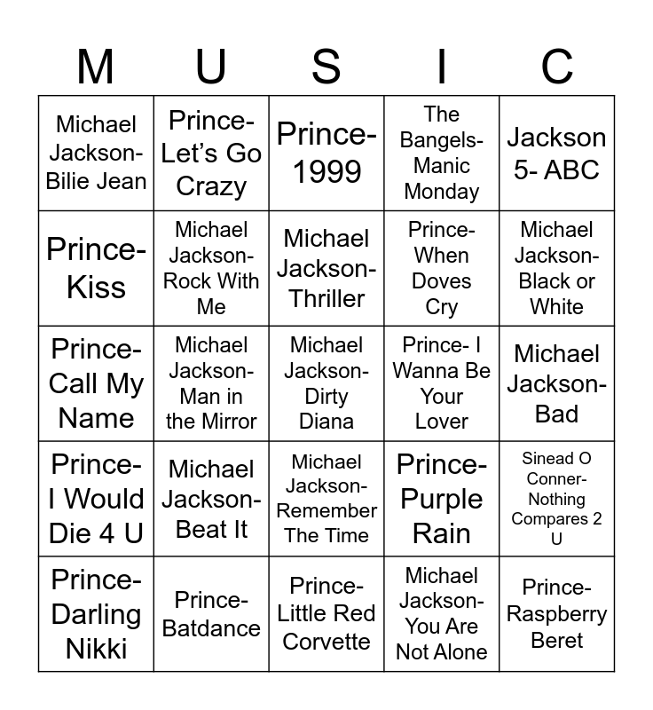 This bingo card has 27 words: Prince- Purple Rain, Prince- Raspberry Beret, Prince- When Doves Cry, Prince- Little Red Corvette, Prince- Kiss, Prince- 1999, Prince- Let’s Go Crazy, Prince- I Would Die 4 U, Prince- I Wanna Be Your Lover, Sinead O Conner- Nothing Compares 2 U, Prince- Call My Name, The Bangels- Manic Monday, Prince- Darling Nikki, Prince- Batdance, Michael Jackson- Black or White, Michael & Janet Jackson - Scream, Michael Jackson- Rock With Me, Michael Jackson- Thriller, Michael Jackson- Beat It, Michael Jackson- Bilie Jean, Michael Jackson- Bad, Michael Jackson- You Are Not Alone, Michael Jackson- Man in the Mirror, Michael Jackson- Dirty Diana, Michael Jackson- Remember The Time, Jackson 5- ABC and Michael Jackson- Smooth Criminal.