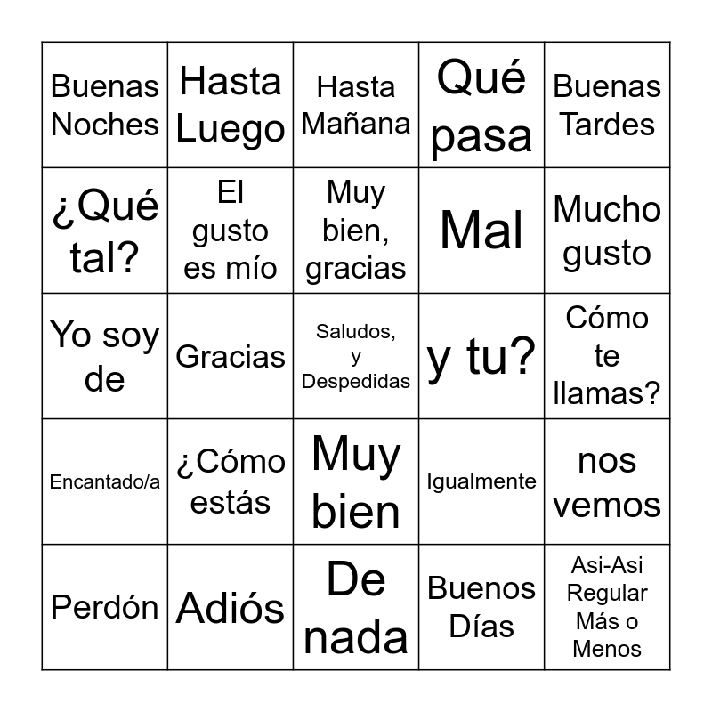 This bingo card has a free space and 24 words: Perdón, ¿Cómo estás, Muy bien, gracias, Buenos Días, Buenas Tardes, Buenas Noches, Hasta Luego, Hasta Mañana, y tu?, Cómo te llamas?, Yo soy de, El gusto es mío, Igualmente, nos vemos, ¿Qué tal?, Adiós, De nada, Qué pasa, Mucho gusto, Encantado/a, Gracias, Muy bien, Mal and Asi-Asi Regular Más o Menos.