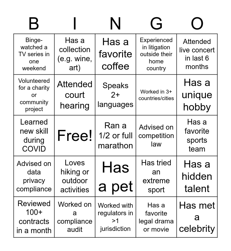 This bingo card has 42 words: Lived in 3+ cities, Speaks 2+ languages, Traveled to 10+ countries, Loves hiking or outdoor activities, Has a favorite legal drama or movie, Has a hidden talent, Ran a 1/2 or full marathon, Loves cooking or baking, Has a favorite coffee, Has a pet, Has a favorite sports team, Has a unique hobby, Free!, Attended live concert in last 6 months, Has a favorite book outside of law, Has tried an extreme sport, Has a favorite travel destination, Learned new skill during COVID, Has a favorite local food spot, Has a collection (e.g. wine, art), Volunteered for a charity or community project, Funny/unusual WFH story, Has met a celebrity, Binge-watched a TV series in one weekend, Has a favorite karaoke song, Taken a cooking class or wine tasting, Worked in 3+ countries/cities, Handled IP litigation, Drafted a patent application, Negotiated cross-border contract, Worked on M&A, Advised on data privacy compliance, Attended court hearing, Worked with regulators in >1 jurisdiction, Experience in trademark disputes, Reviewed 100+ contracts in a month, Worked on a compliance audit, Advised on competition law, Handled crisis management situation, Experience in anti-bribery compliance, Experienced in litigation outside their home country and Presented at an external legal conference.