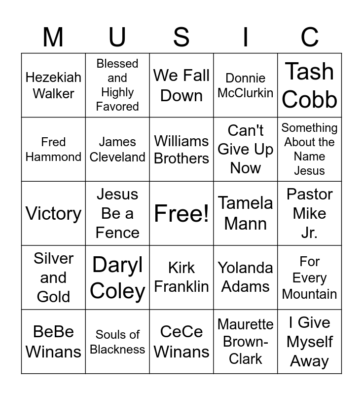 This bingo card has a free space and 54 words: The Best In Me, Silver and Gold, Clark Sisters, Marvin Sapp, Kirk Franklin, Donald Lawrence, Donnie McClurkin, Mary Mary, Fred Hammond, Kurt Carr, Hezekiah Walker, Tye Tribett, Souls of Blackness, BeBe Winans, Le'Andria Johnson, CeCe Winans, I Give Myself Away, Can't Give Up Now, Smile, Pastor Mike Jr., Yolanda Adams, Shirley Caesar, Tamela Mann, Tash Cobb, Every Praise, Blessed and Highly Favored, Ricky Dillard, Smokie Norful, Kierra Sheard, Maurette Brown-Clark, John P. Kee, Open My Heart, Stomp, I Need You Now, We Fall Down, Speak to My Heart, Victory, For Every Mountain, Dottie Peoples, James Cleveland, Tasha Cobbs, Charles Jenkins and Fellowship Chicago, Mahalia Jackson, Jekalyn Carr, Daryl Coley, Andrae Couch, Take 6, Commissioned, Williams Brothers, Jesus Be a Fence, Something About the Name Jesus, Maranda Curtis, Maverick City and Balm in Gilead.