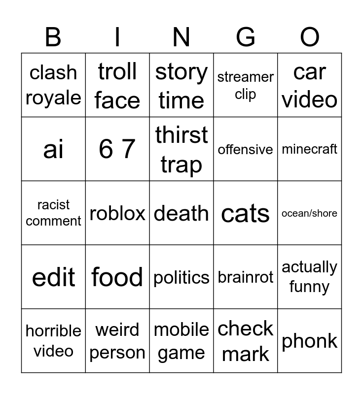 This bingo card has a free space and 24 words: food, weird person, thirst trap, horrible video, car video, clash royale, ai, troll face, cats, politics, offensive, racist comment, brainrot, actually funny, 6 7, check mark, ocean/shore, story time, minecraft, roblox, phonk, edit, streamer clip and mobile game.