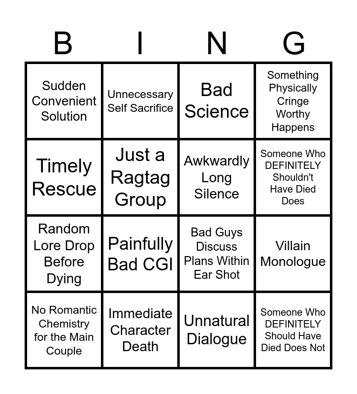 This bingo card has 20 words: Villain Monologue, Random Title Drop, Bad Science, "Chosen One" Trope, No Romantic Chemistry for the Main Couple, Timely Rescue, Immediate Character Death, Sudden Convenient Solution, Random Lore Drop Before Dying, Unnecessary Self Sacrifice, Painfully Bad CGI, Bad Guys Discuss Plans Within Ear Shot, Just a Ragtag Group, Someone Who DEFINITELY Should Have Died Does Not, Awkwardly Long Silence, Reference to a Dark and Mysterious Past, Someone Who DEFINITELY Shouldn't Have Died Does, Something Physically Cringe Worthy Happens, Unnatural Dialogue and Unexplained Plot Moment.