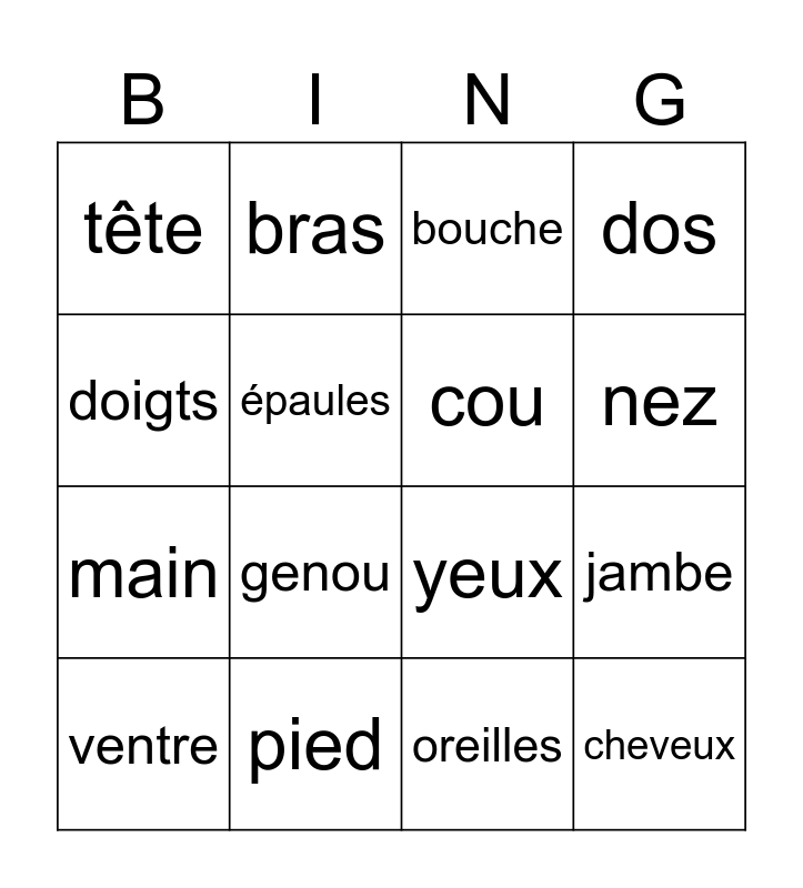 This bingo card has 16 words: pied, jambe, bouche, tête, main, bras, yeux, oreilles, doigts, épaules, ventre, dos, genou, nez, cou and cheveux.