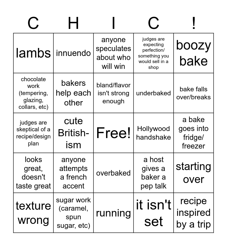This bingo card has a free space and 24 words: anyone attempts a french accent, sugar work (caramel, spun sugar, etc), bland/flavor isn't strong enough, texture wrong, boozy bake, lambs, chocolate work (tempering, glazing, collars, etc), innuendo, Hollywood handshake, overbaked, underbaked, judges are skeptical of a recipe/design plan, a host gives a baker a pep talk, starting over, bakers help each other, it isn't set, a bake goes into fridge/ freezer, anyone speculates about who will win, bake falls over/breaks, cute British-ism, recipe inspired by a trip, looks great, doesn't taste great, judges are expecting perfection/ something you would sell in a shop and running.