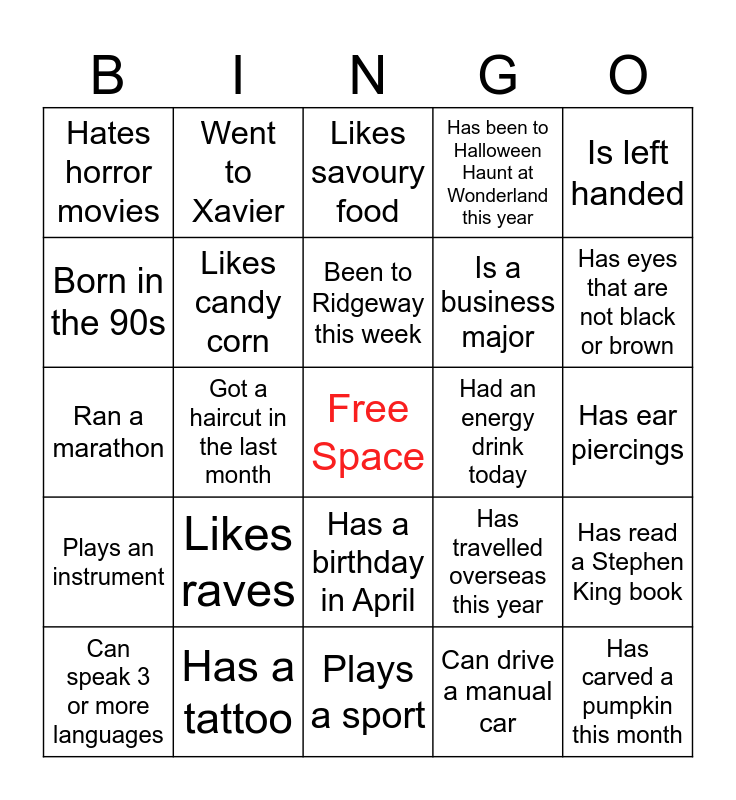 This bingo card has a free space and 24 words: Likes raves, Has a tattoo, Been to Ridgeway this week, Can speak 3 or more languages, Is left handed, Hates horror movies, Born in the 90s, Went to Xavier, Had an energy drink today, Has a birthday in April, Is a business major, Ran a marathon, Has travelled overseas this year, Has read a Stephen King book, Likes candy corn, Can drive a manual car, Has ear piercings, Likes savoury food, Has eyes that are not black or brown, Got a haircut in the last month, Has carved a pumpkin this month, Plays an instrument, Has been to Halloween Haunt at Wonderland this year and Plays a sport.