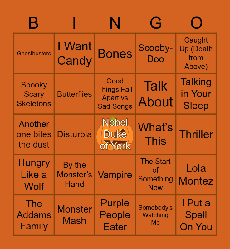 This bingo card has a free space and 24 words: By the Monster’s Hand, Monster Mash, Good Things Fall Apart vs Sad Songs, The Addams Family, Caught Up (Death from Above), Ghostbusters, Spooky Scary Skeletons, I Want Candy, What’s This, Vampire, Talk About, Another one bites the dust, The Start of Something New, Lola Montez, Butterflies, Somebody’s Watching Me, Thriller, Bones, Talking in Your Sleep, Disturbia, I Put a Spell On You, Hungry Like a Wolf, Scooby-Doo and Purple People Eater.