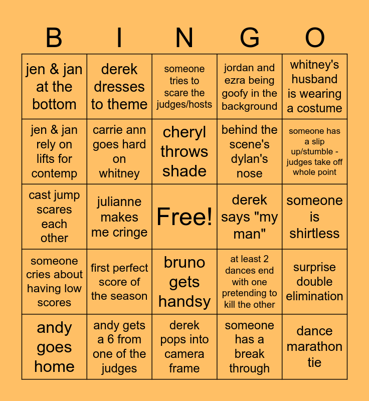 This bingo card has a free space and 24 words: first perfect score of the season, andy gets a 6 from one of the judges, cheryl throws shade, andy goes home, whitney's husband is wearing a costume, jen & jan at the bottom, jen & jan rely on lifts for contemp, derek dresses to theme, derek says "my man", bruno gets handsy, behind the scene's dylan's nose, cast jump scares each other, at least 2 dances end with one pretending to kill the other, surprise double elimination, carrie ann goes hard on whitney, someone has a break through, someone is shirtless, someone tries to scare the judges/hosts, someone has a slip up/stumble - judges take off whole point, julianne makes me cringe, dance marathon tie, someone cries about having low scores, jordan and ezra being goofy in the background and derek pops into camera frame.