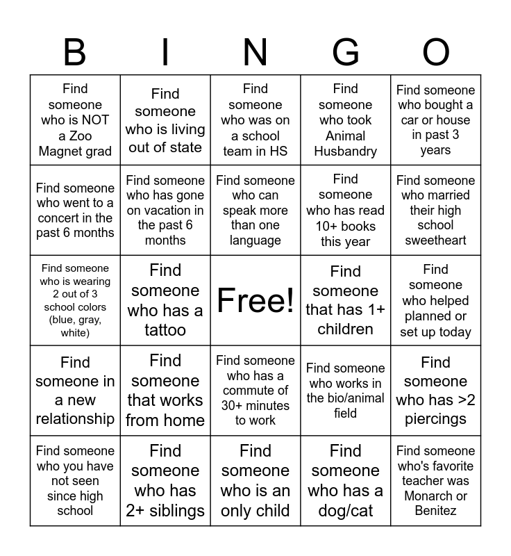 This bingo card has a free space and 24 words: Find someone that works from home, Find someone who has 2+ siblings, Find someone who can speak more than one language, Find someone who you have not seen since high school, Find someone who bought a car or house in past 3 years, Find someone who is NOT a Zoo Magnet grad, Find someone who went to a concert in the past 6 months, Find someone who is living out of state, Find someone that has 1+ children, Find someone who has a commute of 30+ minutes to work, Find someone who has read 10+ books this year, Find someone who is wearing 2 out of 3 school colors (blue, gray, white), Find someone who works in the bio/animal field, Find someone who has >2 piercings, Find someone who has gone on vacation in the past 6 months, Find someone who has a dog/cat, Find someone who helped planned or set up today, Find someone who was on a school team in HS, Find someone who married their high school sweetheart, Find someone who has a tattoo, Find someone who's favorite teacher was Monarch or Benitez, Find someone in a new relationship, Find someone who took Animal Husbandry and Find someone who is an only child.