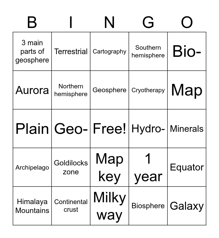 This bingo card has a free space and 50 words: Astronomer, Galaxy, Irregular galaxy, Milky way, Goldilocks zone, Gravity, Terrestrial, Magnetosphere, Aurora, Axis, Northern hemisphere, Southern hemisphere, Equator, 1 year, Orbit, Spherical, Geosphere, Hydro-, Atmo-, Bio-, Geo-, Biosphere, 3 main parts of geosphere, Cryotherapy, Layers of the atmosphere, Air pressure, Map, Compass rose, Cartography, Map key, Hemisphere, Lines of latitude, Lines of longitude, Oceanic crust, Continental crust, Continents, Tectonic plates, Magma, Earthquake, Minerals, 3 types of rock, Weathering, Glaciers, Mountain range, Himalaya Mountains, Plain, Canyon, Island, Archipelago and Wetlands.