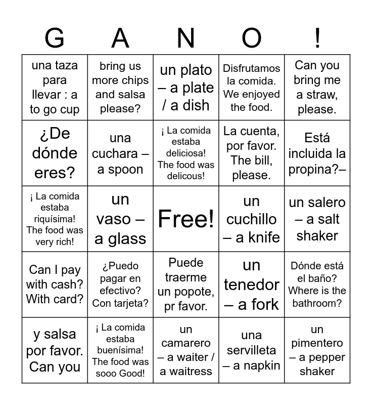 This bingo card has a free space and 31 words: un camarero – a waiter / a waitress, Quiero… – (I want…), un vaso – a glass, una taza – a cup, una taza para llevar : a to go cup, un plato – a plate / a dish, una cuchara – a spoon, un tenedor – a fork, un cuchillo – a knife, una servilleta – a napkin, un salero – a salt shaker, un pimentero – a pepper shaker, Un té mitad y mitad – a tea half and half, Un té dulce – a sweet tea, Está incluida la propina?–, Is the tip is included?, Dónde está el baño? Where is the bathroom?, ¿Puedo pagar en efectivo? Con tarjeta?, Can I pay with cash? With card?, Puede traerme un popote, pr favor., Can you bring me a straw, please., Puede traernos más totopos, y salsa por favor. Can you, bring us more chips and salsa please?, La cuenta, por favor. The bill, please., ¿De dónde eres?, Disfrutamos la comida. We enjoyed the food., ¡ La comida estaba riquísima! The food was very rich!, ¡ La comida estaba buenísima! The food was sooo Good!, ¡ La comida estaba deliciosa! The food was delicous! and ¡La comida estaba muy sabrosa! The food was very tasty!.