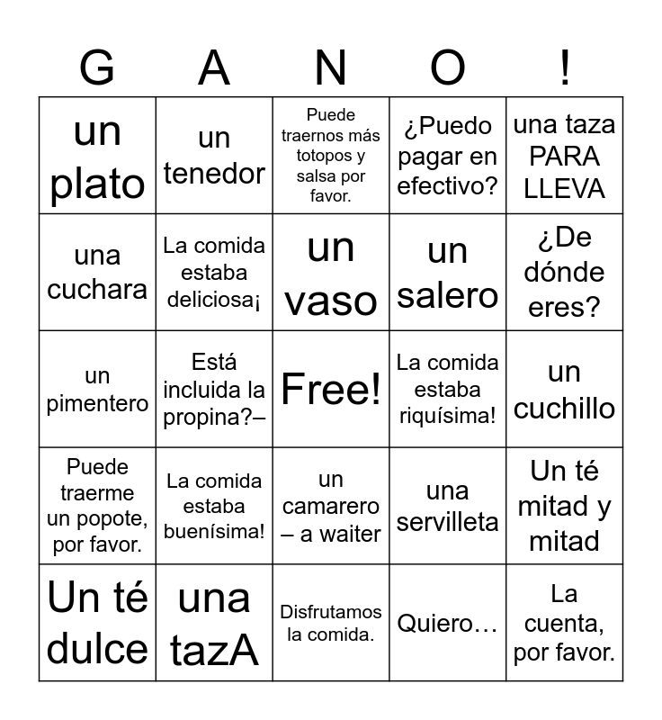 This bingo card has a free space and 26 words: un camarero – a waiter, Quiero…, un vaso, una tazA, una taza PARA LLEVA, un plato, una cuchara, un tenedor, un cuchillo, una servilleta, un salero, un pimentero, Un té mitad y mitad, Un té dulce, Está incluida la propina?–, Dónde está el baño?, ¿Puedo pagar en efectivo?, Puede traerme un popote, por favor., Puede traernos más totopos y salsa por favor., La cuenta, por favor., ¿De dónde eres?, Disfrutamos la comida., La comida estaba riquísima!, La comida estaba buenísima!, La comida estaba deliciosa¡ and La comida estaba muy sabrosa!.